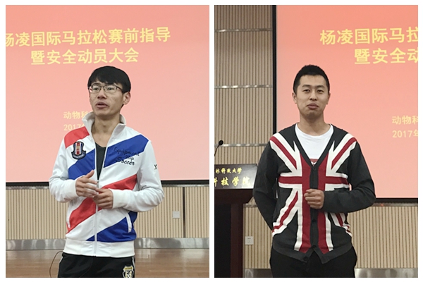 2016年杨凌马拉松全程参加者钟明智和半程参加者夏博分享了自己的参赛技巧,建议同学们以积极乐观的心态对待此次比赛,放松身心、重在参与;赛前要进行热身活动,防止肌肉拉伤;起跑后要根据自己的习惯保持较匀速的节奏,避免急加速受伤;中途适量补充水分,及时补充碳水化合物;在身体机能感到不适时,要及时调整,放慢速度,量力而行,必要时果断放弃。