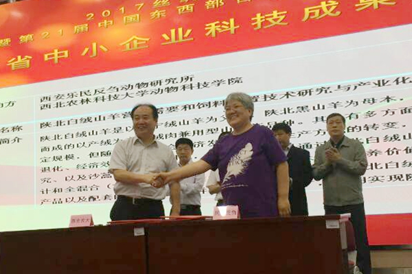 6月5日,2017丝绸之路国际博览会暨第21届中国东西部合作与投资贸易洽谈会举行期间,在陕西省科技成果产业化系列活动产学研合作签约仪式上,我院绒肉羊遗传改良与种质创新团队负责人陈玉林教授与西安乐民反刍动物研究所执行董事马小林女士共同签署了“陕北白绒山羊营养需要和饲料配制技术研究与产业化”项目合作协议。陕北白绒山羊营养需要和饲料配制技术研究与产业化项目主要是立足陕北白绒山羊各个生理阶段营养需要量研究的成果,以及建立的陕北常用18种精粗饲料资源,如玉米、豆粕、苜蓿、沙打旺、柠条、花榜等营养成分含量的数据库,设计日粮配方,并结合全混合(TMR)技术,开发出适合陕北白绒山羊各个生理阶段的系列饲料产品以及配套的饲养技术,全面提升陕北白绒山羊舍饲养殖技术水平和养殖效益。双方的成功签约标志着宅宅爱动漫 历时八年的陕北白绒山羊营养需要和饲养标准研究正式转入产业化和成果转化阶段。