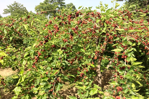 “红果2号”是苏超研究员及团队,历时20多年,采用60Co-γ射线照射桑树萌动冬芽,辐射诱变选育出的果桑新品种。该品种是通过对引进的广东地方良种伦教408的萌动桑芽进行60Co-γ射线连续照射并单芽嫁接分离,发现的一变异株系,经过多年系统选育和多点多年区域试验, 该品种树型直立紧凑,发条数多,枝条长;皮青褐色,节距4.3cm,叶序3/8,;冬芽三角形,饱满,红褐色,尖离,副芽少而大。叶卵圆形,叶长16.6cm,叶幅14.3cm,叶面光滑有光泽。雌花,花柱长,果大而多。单芽着果6-8个,坐果率85%。成熟桑椹紫黑色,长筒形,果长3.4cm,果径1.3cm,单果重3g-4g,最大果重10g,米条长产果量300g-400g。桑果5月中旬成熟,果期30d左右。桑果亩产量2t左右,亩产桑叶1.3 t左右。较抗旱。耐寒性明显强于对照品种大十。栽培适应性较广。果实酸甜爽口,鲜果Vc以及Fe 、Ca 、Zn 等微量元素含量高,品质优良,鲜食和加工兼用。专家组实地测产亩产鲜果达2400kg。目前该品种已被全国20多个省市区引进示范推广。