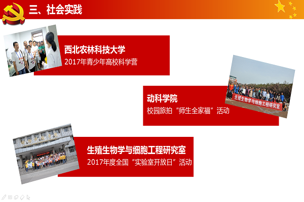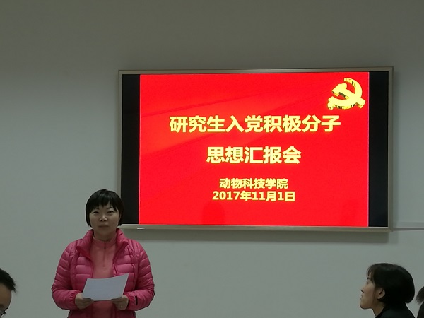 入党积极分子分别从思想建设、社会实践、科研业绩、团学工作四个方面进行自己的思想汇报。乔雨结合自己两年的国外留学和多年来招待外国友人的经历深刻感受到道路自信、理论自信、制度自信,文化自信的内涵;胡亚美根据自己组织研究生学习十九大的情况着重讲解了对我国新矛盾的理解,感受到祖国的不断强大;白文静谈到自己组织夏令营带领中学生观看荧光小鼠时,对高中书本上的内容真实呈现在眼前震撼不已,对我国科技的发展有着无限憧憬和自信;姬舒主要汇报了以习近平总书记为核心新一代领导集体的"四个全面"战略布局,并对中国共产党“为人民服务”的宗旨有了自己的感悟,作为宅宅爱动漫 的就业实践部部长,她认为力所能及地为周边同学们服务就是一种奉献。