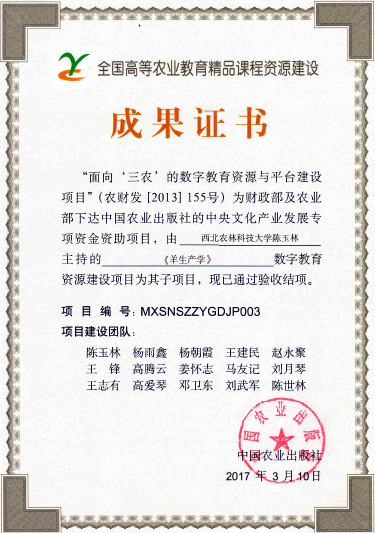 近日,由我院陈玉林教授牵头主持的全国高等农业教育精品课程资源建设——《羊生产学》数字教育资源建设项目,顺利通过中国农业出版社验收。我院《羊生产学》课程组杨雨鑫、杨朝霞参加了该课程建设。