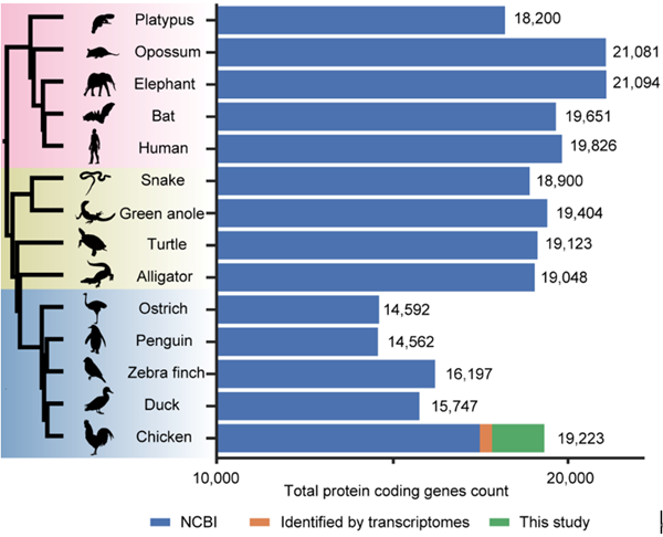 哺乳动物、爬行动物和鸟类中代表性物种的蛋白质编码基因数目
