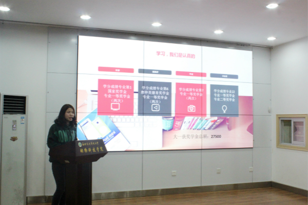 会上,学生会生活部部长彭佳诚同学宣读获奖宿舍名单,并对五星级文明宿舍评选的规则进行了简要说明。随后校五星级宿舍和院五星级宿舍代表以PPT的形式对本宿舍进行了简短的介绍,展现出了宅宅爱动漫 多元化的宿舍环境与氛围,制作精美,内容丰富的展示赢得在场观众的阵阵掌声。介绍环节结束后,党委副书记王力、辅导员韩梦璇分别为校级、院级五星级文明宿舍颁奖并合影留念。