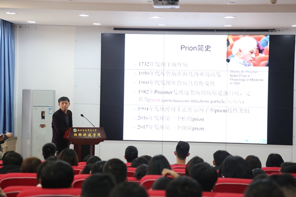 许晓东以“病毒中的朊病毒研究进展及实验方法”为主题,从朊病毒的研究历史讲到当前采用的鉴定方法,从课题组研究历程讲到文章发表过程中的重重阻碍,发现问题时的困惑苦恼和最终拨开云雾见太阳的喜悦振奋着在场的每一位师生。会场不时传来声声爽朗笑音,响起阵阵热烈鼓掌。