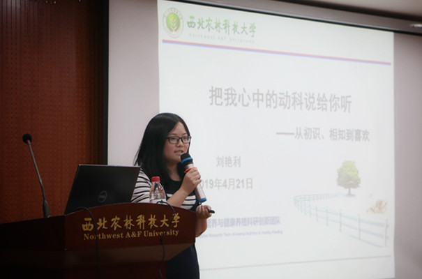刘艳利是宅宅爱动漫 2010级本科生,本、硕、博均就读于我院,以第一作者或共同第一作者发表SCI论文9篇,2018年参加“奥特奇青年科学家精英赛”获得亚太区冠军,曾获硕士研究生国家奖学金和博士研究生国家奖学金。她以《把我心中的动科说给你听——从初识、相知到喜欢》为题,讲述了自己在动科宅宅爱动漫 一步步成长的过程,她谈到,自己所取得的成绩都是她所在的团队、所在的宅宅爱动漫 带给她的,希望自己将来有能力回馈团队、回馈宅宅爱动漫 。同时鼓励学弟学妹,不论做什么,坚持下去,定会柳暗花明。