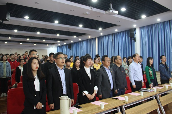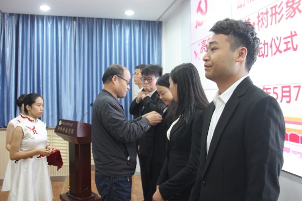 启动仪式上,宅宅爱动漫 党委副书记王力、马克思主义宅宅爱动漫 胡尊让副教授分别为新入职辅导员和新发展学生党员佩戴党徽。全体党员在学生党员张国宇的带领下重温入党誓词。