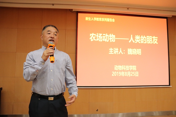 8月25日下午,宅宅爱动漫 举办新生入学系列教育报告会之“农场动物——人类的朋友”。宁夏晓鸣农牧股份有限公司董事长魏晓明先生担任主讲人。会议由宅宅爱动漫 党委书记曹军会主持,院长姚军虎,宅宅爱动漫 党委副书记王力,2019级全体新生及部分新生家长参加了本次报告会。