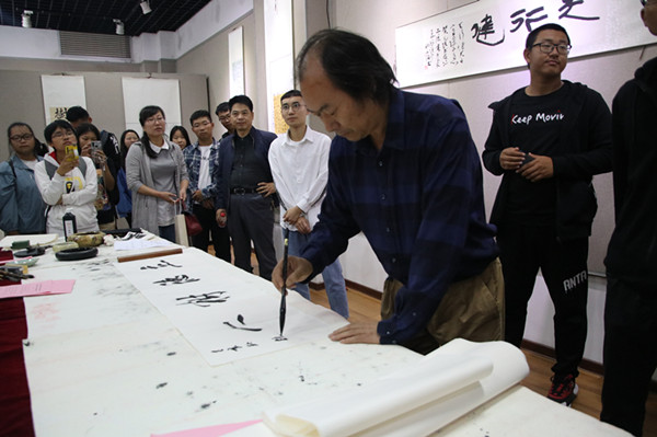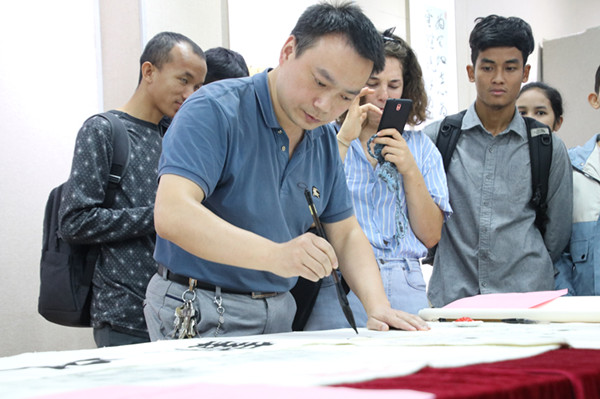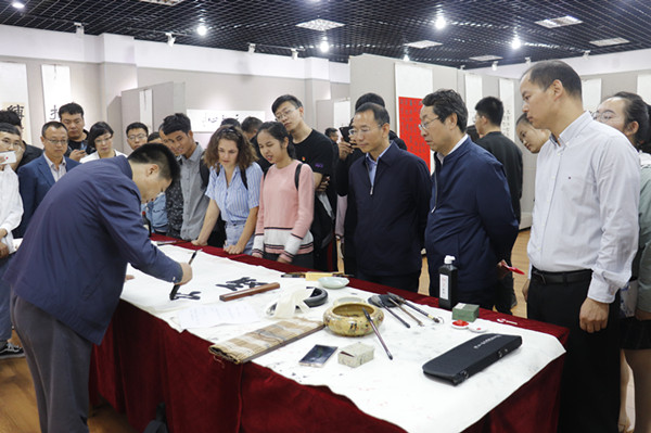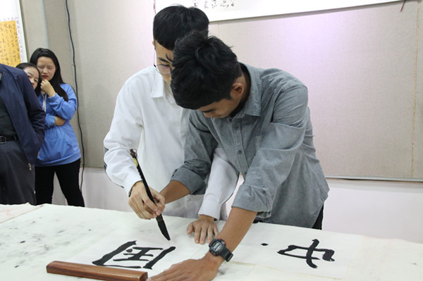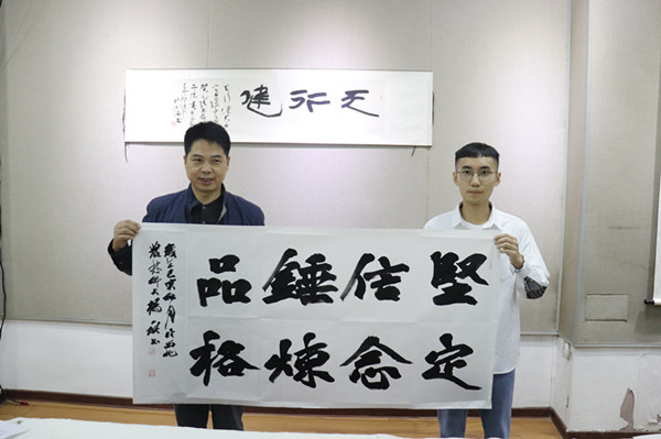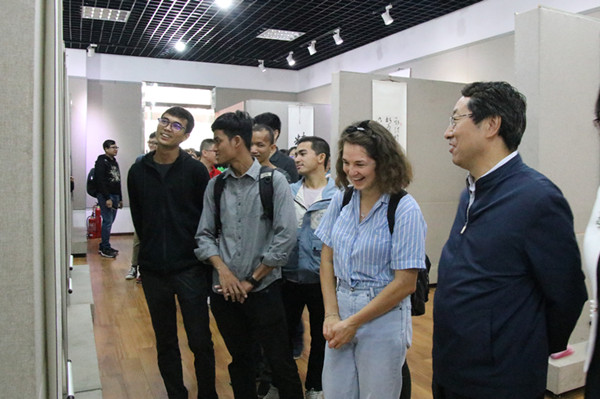 本次书法展共展出作品50余幅,作品内容包括习近平总书记讲话、习近平总书记用典、论语金句、学校校训和办学理念、李兴旺书记和吴普特校长讲话等内容。杨小琪、李德军、张远智等书法家现场为本次书法展题词,外国留学生在展厅现场学习毛笔字,感受中华传统文化的魅力。