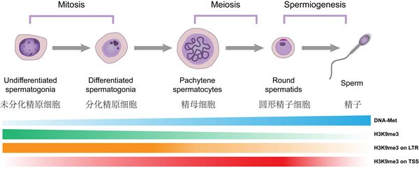 精子发生是一个高度复杂且有序的动态变化过程。本研究通过低细胞量ChIP-seq(Ultra-low-input micrococcal nuclease-based native ChIP-seq)和全基因组甲基化测序(WGBS)分析,首次建立了精子发生过程中全基因组DNA甲基化和H3K9me3的动态修饰图谱。在精子发生过程中H3K9me3修饰域数量逐渐减少,DNA甲基化修饰在减数分裂前仍处于上升阶段,其后与精子中DNA甲基化修饰量趋于一致。在粗线期精母细胞(PS)和圆形精子时期(RS),H3K9me3修饰更多参与基因的表达调控,而在减数分裂之前H3K9me3修饰更多的富集在重复序列区域。与PS时期相比,RS时期X染色体在整体上基因启动子处富集H3K9me3修饰。但同时也有一类基因的启动子区域在PS时期富集H3K9me3修饰,而在RS时期H3K9me3修饰减少。最后阐述了对父本和母本的印记调控区域的DNA甲基化和H3K9me3的动态修饰,可为后续研究印记调控区域(gICR)及印记基因提供新的思路。