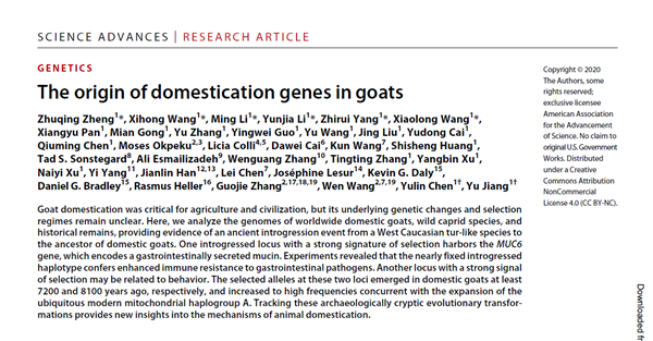 5月20日,Science旗下著名期刊ScienceAdvances《科学进展》以封面论文报道了宅宅爱动漫 动科宅宅爱动漫 姜雨教授团队有关“山羊驯化基因的起源””的文章,阐明了现代山羊广谱适应能力强源于通过杂交获得其他物种的MUC6基因, 该基因与其他驯化基因一起,帮助山羊成为最早被成功驯化并广泛传播的家畜。同日,《科学》杂志正刊以“Ancient hanky panky gave modern goats their iron stomachs”为题,对该发现进行了采访和报道。
