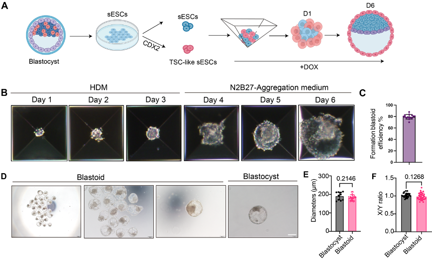 图2: 构建绵羊的类胚胎模型 A.野生型绵羊胚胎干细胞(sESCs)与CDX2诱导型胚胎干细胞(iCDX2 sESCs)共培养生成绵羊类囊胚的流程图。B.绵羊类囊胚在不同时间点形成过程。C.类囊胚形成效率统计图。D.绵羊类囊胚与正常绵羊囊胚的形态。E.绵羊类囊胚与正常E7期绵羊囊胚的直径分析。F.绵羊类囊胚与天然E7期绵羊囊胚的X/Y轴分析。