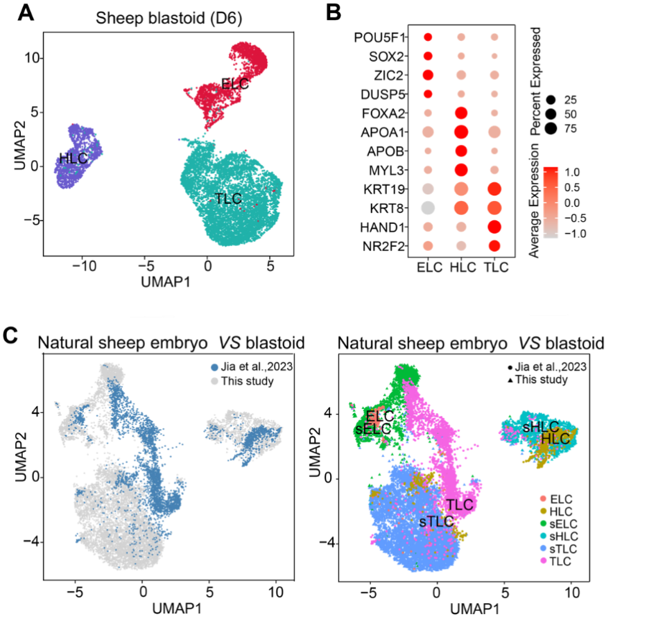 图3: 绵羊的类胚胎的转录组特征 A.绵羊类囊胚中主要细胞类型。ELC:EPI 样细胞;HLC:下胚层样细胞;TLC:滋养层样细胞。B. 绵羊类囊胚三种细胞系, ELC、HLC 和 TLC 标志基因的表达情况。C. UMAP 图展示 D6 绵羊类囊胚与正常胚胎中细胞的聚类情况
