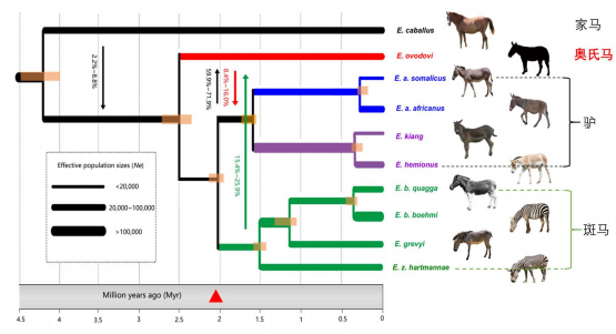 奥氏马化石在北美、非洲、西南西伯利亚以及中国东北均有发现,尽管存在丰富的材料,但对奥氏马的相关研究仍存在较大空白,多个问题始终没有得到解决:1)它们是如何演化的?2)与家马、驴和斑马之间是否有过混血?3)它们又是何时灭绝的?该研究显示奥氏马与家马的关系较远,是驴和斑马的近亲,相互间存在较多的基因流。研究进一步对奥氏马的史前群体规模进行了评估,显示奥氏马在距今七万四千年左右达到群体规模峰值,之后伴随几次重大的气候变化(特别是末次盛冰期)和人类在欧亚大陆的大规模扩张,奥氏马群体数量在人类的捕食下持续下降,并在距今一万三千年前趋于稳定。研究首次证实奥氏马在青铜时代仍然幸存,但并没有经历过任何驯化,相对较低的基因杂合度表明奥氏马在青铜时期种群数量已经相当有限,可视为其灭绝的前兆。此外,由于该马种形态较小,介于马和驴之间,形态上极易被鉴定为驴,该研究为动物考古学家提供了新的线索,有必要对早期马骨的形态学研究进行重新审视。该研究为探索全新世以来其他大型动物的演化历史提供了重要参考,更新了我们关于中国早期野马的认识,为中国家马的起源与驯化研究提供了重要线索。马和驴的跨物种杂交可以产生重要的役用动物骡子,那么奥氏马和马的杂交也极有可能产生另有优势的杂交动物,尤为可惜的是奥氏马已经灭绝了。不过重新获得其全基因组序列,将使得利用最新基因编辑工具在马和驴上部分恢复其潜在的优良性状。