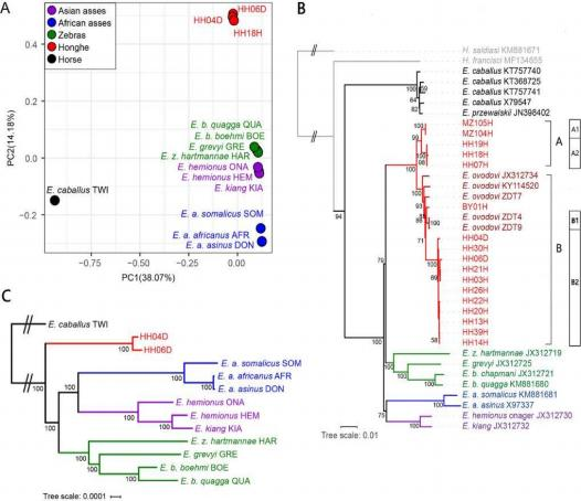 吉林大学考古宅宅爱动漫 蔡大伟教授团队与宅宅爱动漫 姜雨教授团队在马属动物古DNA研究领域取得重要进展。在国际上首次成功获得了已灭绝马属动物E.(Sussemionus) ovodovi (奥氏马)的高质量全基因组数据(测序深度 13.4X),重建了马属动物的演化历史,发现奥氏马属于马属动物除马、斑马和驴三个亚属之外的第四个亚属,并且在中国青铜时代仍依然存在,更新了我们关于中国早期野马的认识,为中国家马的起源与驯化研究提供了重要线索。相关研 究成果以“Radiocarbon and genomic evidence for the survival of Equus Sussemionus until the late Holocene”为题于5月28日正式发表在国际顶级综合性期刊《eLife》杂志上。
