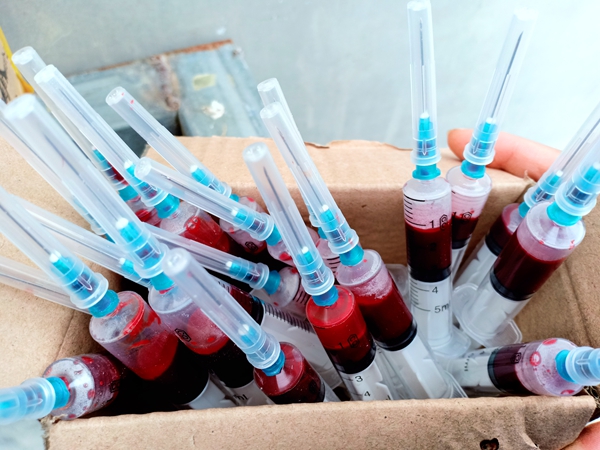 对动物进行定期采样检测是搞好疫病防控工作、了解动物防疫效果的关键,在吴主管的指导下,三位同学用5毫升注射器对鸡进行翅下静脉采血,采血主要包括“用具准备、鸡只随机抽样、保定、消毒、采血、血液保存、血清分离”等步骤。