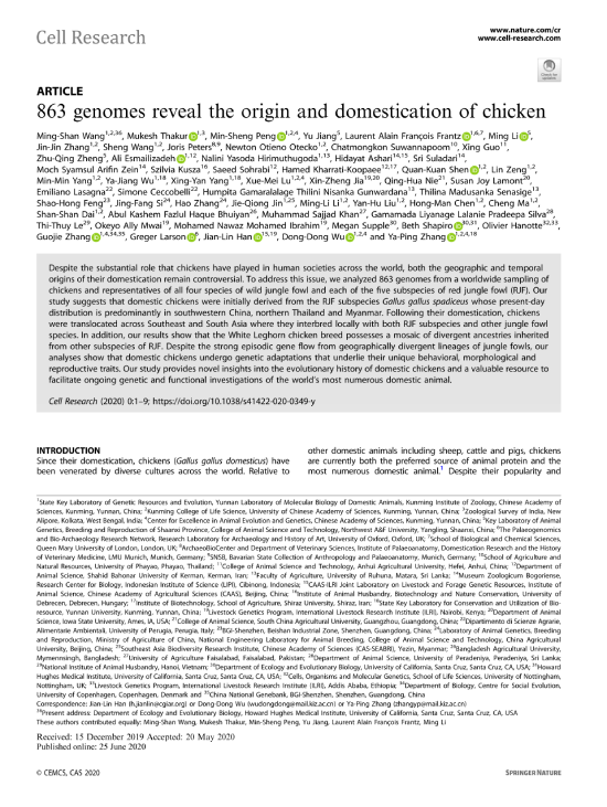 尽管家鸡对全人类的生产和生活产生了世界性的影响,但其驯化的地点和时间仍存在巨大争议。2020年6月25日,中国科宅宅爱动漫 昆明动物研究所和中国农业科宅宅爱动漫 北京畜牧兽医研究所牵头,联合国内外30余家高校和科研单位共同完成,在 Cell Research 在线发表了题为“863 genomes reveal the origin and domestication of chicken”的原创性研究论文。本研究首次系统地对包括分布于南亚、东南亚和东亚的地方鸡品种和所有四个原鸡种以及红原鸡五个亚种在内的863份样品的全基因组进行了测定,这一成果为深入认识家鸡的演化过程提供全新的视野,并有助于理解这一地区人类与其它驯化物种(例如水稻、狗、水牛和家猪等)互动的历史。张亚平院士、吴东东研究员及韩建林教授共同通讯,我院姜雨教授、中国科宅宅爱动漫 昆明动物研究所王明山和彭旻晟博士、印度国家动物学普查机构M. Thakur博士、和在读博士生李鸣及英国牛津大学L. A. F. Frantz博士为该论文共同第一作者。