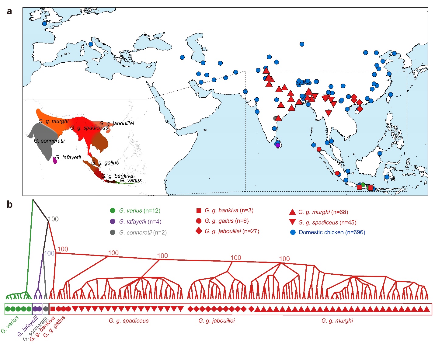 进一步地分析比较表明家鸡最初起源于红原鸡的滇南亚种( Gallus gallus spadiceus ),其主要分布在中国西南部、泰国北部和缅甸。驯化之后,随着人类的迁徙和贸易活动,驯化后的家鸡首先被携带到东南亚和南亚,进而与在那里分布的红原鸡的其它亚种以及原鸡的另外三个种发生了不同程度的杂交,这种基因交流推动了家鸡对新环境的快速遗传适应,并丰富了其独特的行为、形态和繁殖性状。早先有关家鸡驯化的研究往往仅基于母系遗传的线粒体DNA信息或数量有限的、来源于家鸡潜在起源地之外的商业或地方鸡品种的基因组数据;另外前人的研究也很少获得过物种背景信息明确可靠的原鸡样品,这些因素都限制了人们对家鸡驯化过程的全面认识。