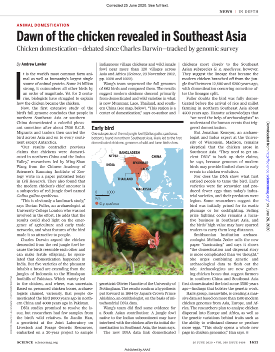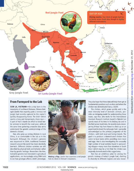 特别值得一提的是,在该论文发表之际, Science 杂志在Animal Domestication专栏发表了题为“Dawn of the chicken revealed in Southeast Asia: Chicken domestication—debated since Darwin—tracked by genomic survey(东南亚鸡的黎明破晓:基因组大数据诠释始于达尔文的家鸡驯化纷争)”的点评文章,通过采访伦敦大学宅宅爱动漫 的Dorian Fuller博士、威斯康辛大学(麦迪逊)的Jonathan Kenoyer博士(美国艺术与科学宅宅爱动漫 院士)以及史密森学会的Melinda Zeder博士(美国艺术与科学宅宅爱动漫 院士和美国科宅宅爱动漫 院士)等国际考古学著名学者,第一时间对该项研究成果进行系统地盘点。这也是继 Science 于2012年介绍中国农业科宅宅爱动漫 -国际家畜研究所“畜禽牧草遗传资源联合实验室”韩建林教授有关鸡的研究工作之后,再次深度点评他及合作团队在家鸡起源和驯化方面的重要发现。