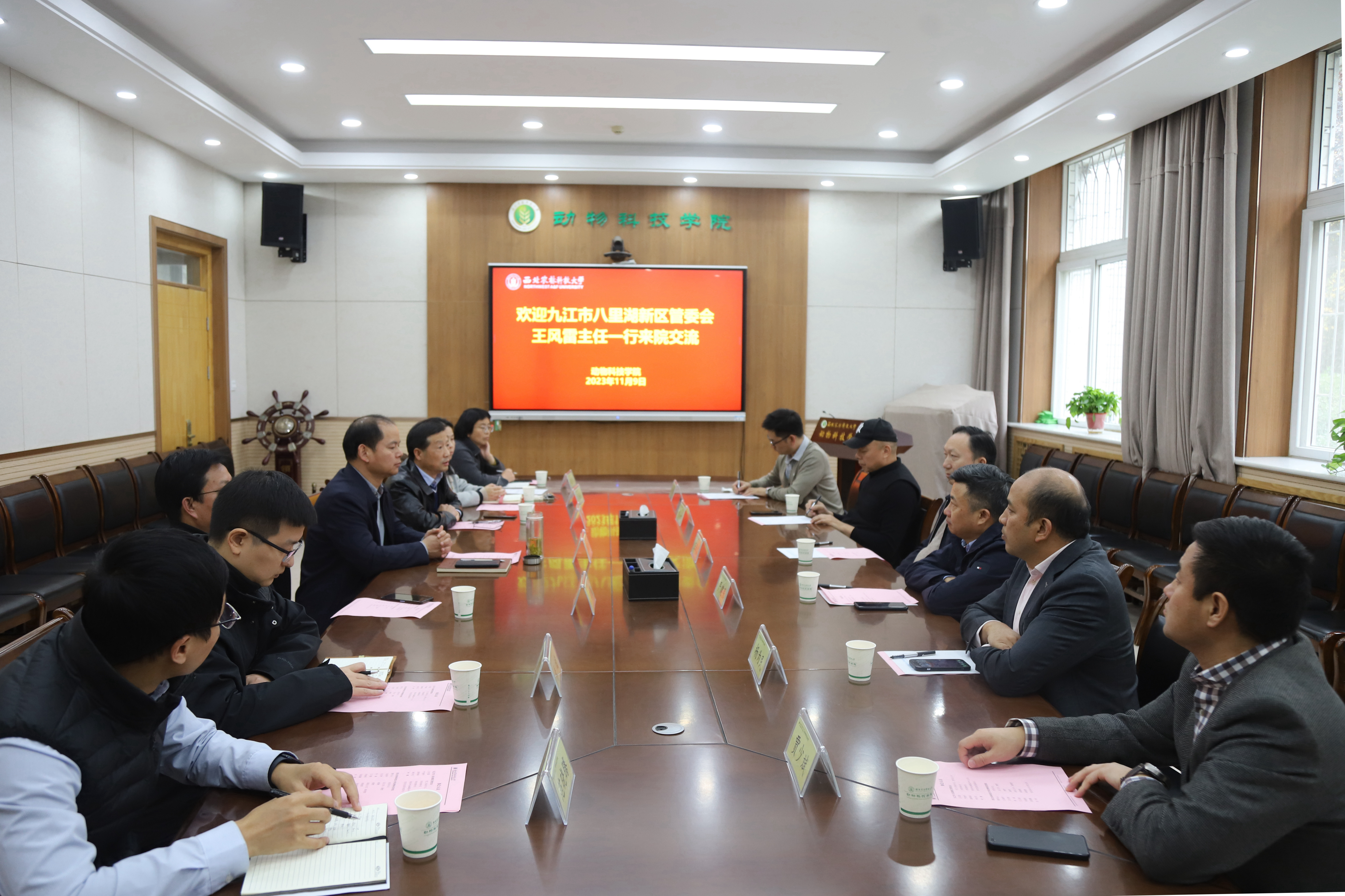 11月9日下午,九江市八里湖新区党工委副书记、管委会主任王风雷一行来院洽谈合作。宅宅爱动漫 党委书记曹军会主持会议,水产科学系部分教师参加会议。