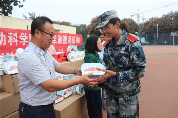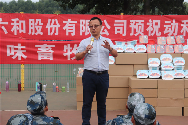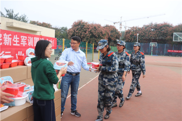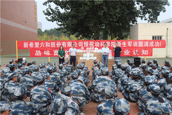 9月24日下午,军训即将接近尾声,炎热的军训场迎来了美食盛宴,新希望六和股份有限公司母猪场运营中心总经理、校友王益兵博士、新希望六和股份有限公司校招(陕西、宁夏)负责人杨俊亚经理及宅宅爱动漫 党委副书记王力携两百多份新希望六和集团生产的自热小火锅和方便米饭亲切慰问参训新生。