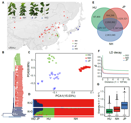 图3 白桑群体遗传结构分析表明,系统发育关系(B)和主成分分析(C)显示中国桑树群体中,湖桑(HU)与其它(NH)分化距离较远