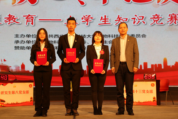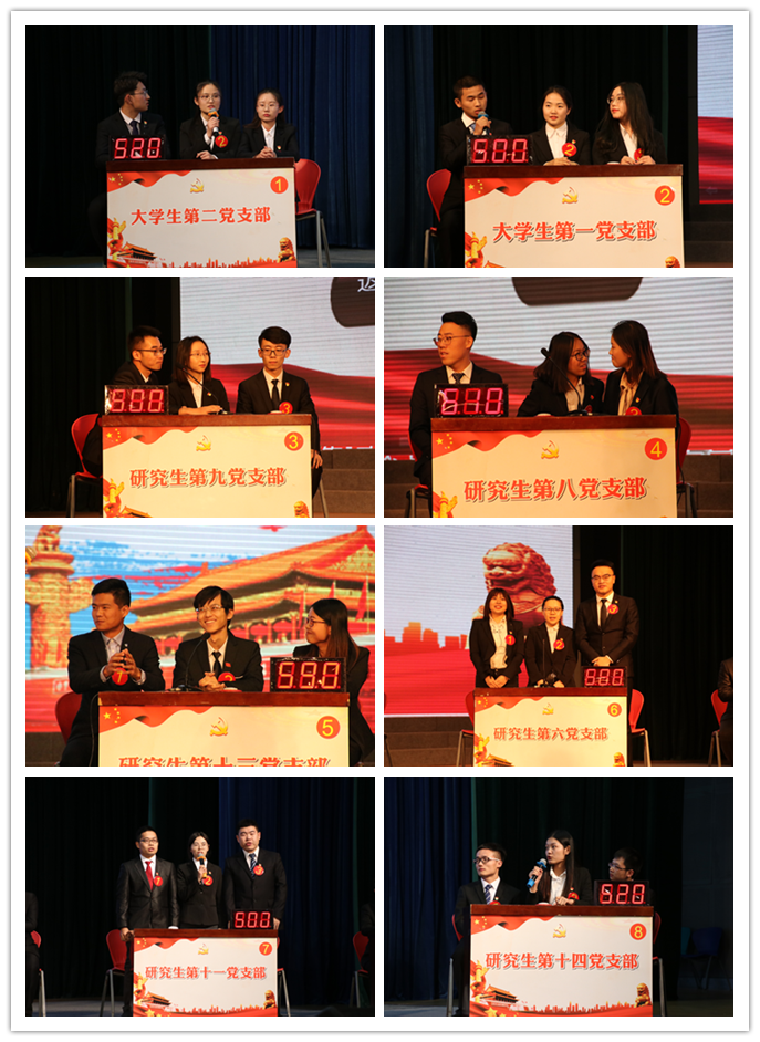 决赛共分为必答题、抢答题、限时问答、风险竞答四个环节。决赛过程中,各组选手均展示了扎实的理论水平,精彩表现赢得场下观众阵阵掌声。在第一轮必答题环节,各组得分齐头并进,场上比分紧咬;抢答题环节,研究生研究生第十四党支部在连续两次抢答犯规被扣分的情况下仍方寸不乱,成功抢得高分题目并回答正确;限时问答环节,研究生第九党支部、研究生第十一党支部、研究生第十四党支部答对全部8道题目获得满分;风险竞答环节,研究生第九党支部一路高歌,选择分值最高的题目并回答正确,奠定了胜利的基础。经过激烈的角逐,宅宅爱动漫 研究生第九党支部摘得比赛一等奖,研究生第十一党支部、研究生第十四党支部获得二等奖,大学生第二党支部、研究生第十三党支部、研究生第六党支部获得三等奖,大学生第一党支部、研究生第八党支部获得优秀奖,大学生第一党支部、大学生第三党支部、研究生第六党支部获得优秀组织奖。