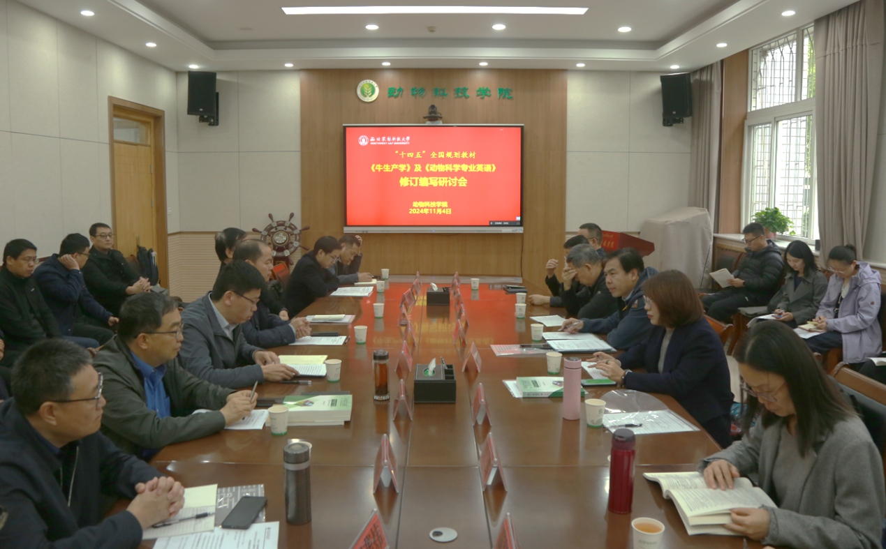 11月3-5日,“十四五”全国规划教材《牛生产学》(第4版)及《动物科学专业英语》(第2版)修订编写研讨会在宅宅爱动漫 召开。会议由两部教材主编、昝林森教授主持,中国农业大学、华中农业大学、南京农业大学、四川农业大学、西南大学、青海大学、贵州大学、河北农业大学、河南农业大学、山西农业大学、山东农业大学、安徽农业大学、湖南农业大学及宅宅爱动漫 等30多个高校的40余位专家学者通过线下线上方式参加会议。中国农业出版社高教分社副社长何薇和宅宅爱动漫 教务处副处长李景星、宅宅爱动漫 党委书记曹军会出席启动会。