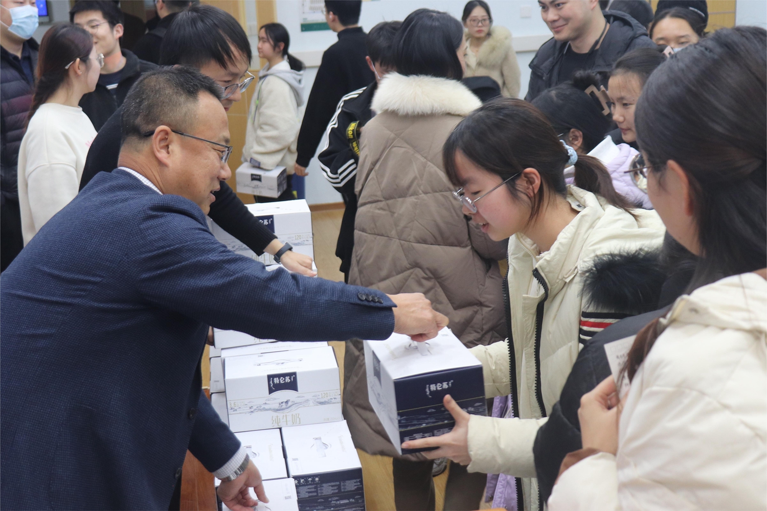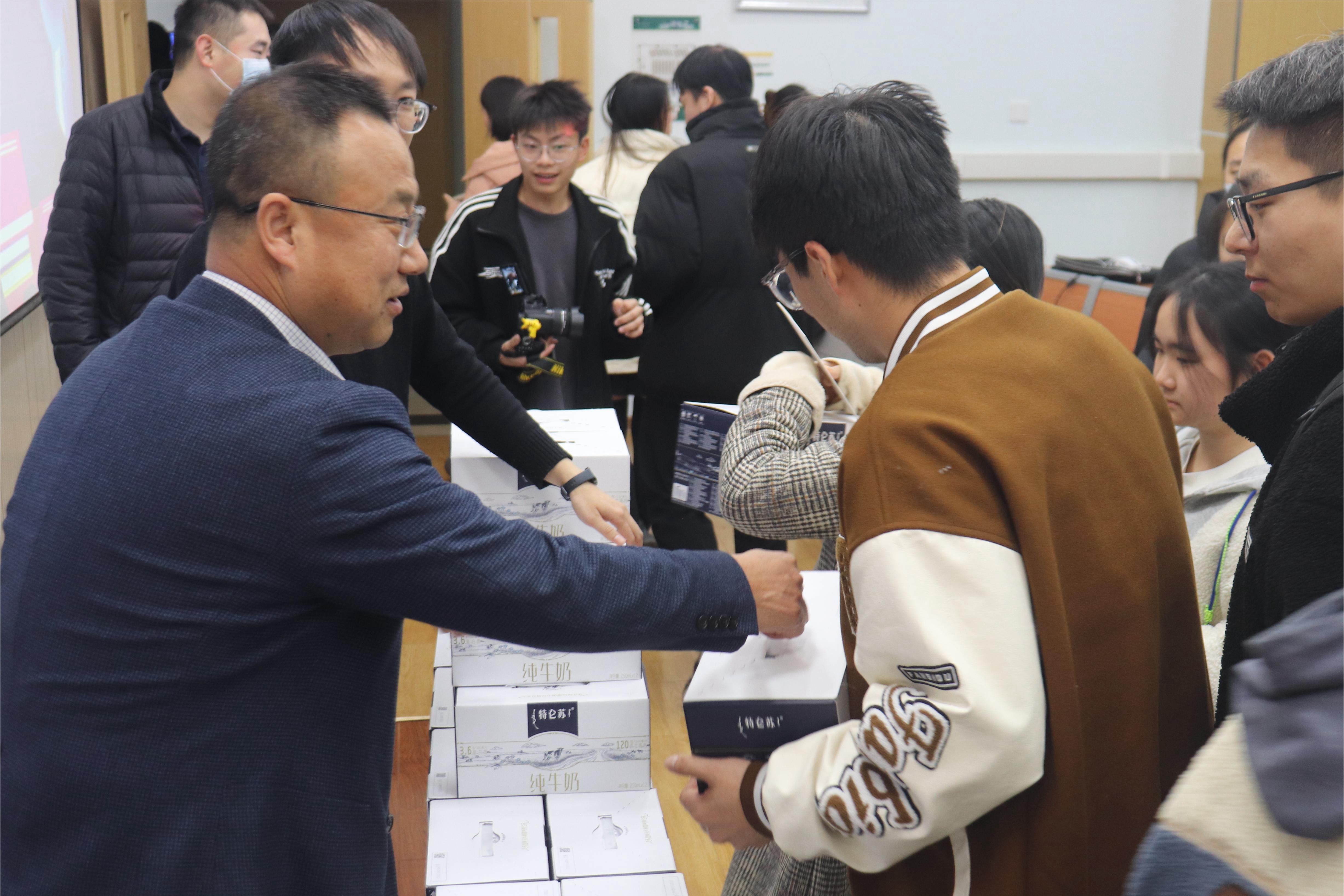 随后,王力为同学们分发宅宅爱动漫 准备的特仑苏牛奶和低年级学生准备的祝福卡片,给同学们补营养、送温暖。