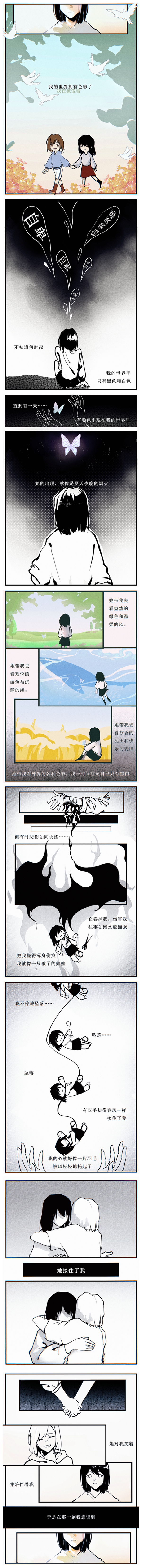 黑白世界是我对他们心里状况的一个总结。自卑,迷茫等情绪会充斥生活,他们不像盲人一样失去视觉,却看不到生活的色彩,他们失去了生活的热情。蝴蝶象征着“朋友”,打破了她孤单世界的沉浮,也让女孩看到了一丝“希望”。女孩在朋友的陪伴下最终承认了自己,承认了生活,在朋友的帮助下走出黑暗,重新看到生活的色彩。